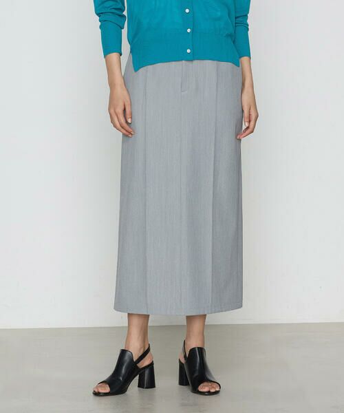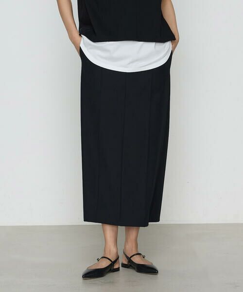 《デザイン》素材のかっこ良さを活かしたミニマルなスカートです。シャープなピンタックのデザインがシンプルの中にも、モードなアクセントにしています。フロントのピンタックは繊細でありながら立体感を生み、細身のシルエットでも腰周りも目立たず、たてにっすっきり見えるデザインです。Iラインに近いシルエットですが2WAYストレッチのシルエットと、後ろウエストゴムで楽ちんな着心地です。さらに後ろにベンツで足さばきもしやすくしています。《素材》ヴィンテージのキャバルリーツイル(綾織が急傾斜で、うねがはっきりと見える生地)を軽量化してポリエステルで再現できないかと作られた素材です。ウールの梳毛糸工程を経た糸を使用しているので、他のポリエステルとは一線を画す光沢や表情がグレードがありながら、取扱いしやすく2WAYストレッチの着心地の良さも魅力です。うねの立ったカルゼ組織の凸凹感と程良い肉感で膨らみがあります。ドライでカリッとしたタッチでマニッシュな印象と共にドレープ性があるので、美しいシルエットを生み出します。