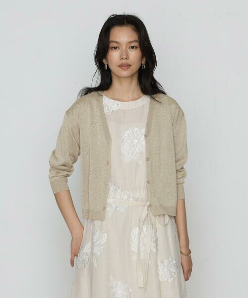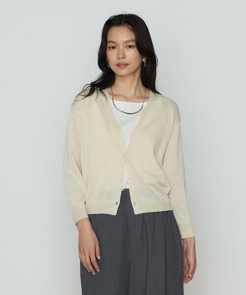 《デザイン》ドルマン風のゆとりのある袖のシルエットが着やすいラメニットカーディガンです。ベーシックなシルエットながらも一枚あるとキラキラアクセントになり、便利に使えるカーディガンです。《素材》ナチュラルなリネン混素材とラメ糸の組み合わせです。リネン混糸のラメ糸を一緒に編み立てている編地は表面にラメ糸が出るように編んでいるので、ラメ感が際立ちキラキラです。亜麻色、チャコールはキラキラで、レモンイエローは色目を活かした控えめラメ感です。