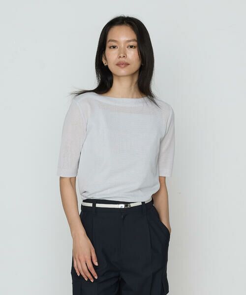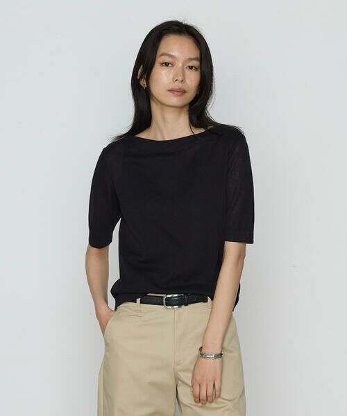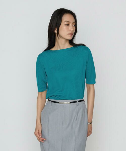 襟元は見返し仕様のクリーンな仕様で、鎖骨に沿ってカーブを描くボートネックは首元がすっきりと美しく見えるカッティングがポイントです。
