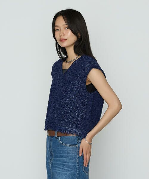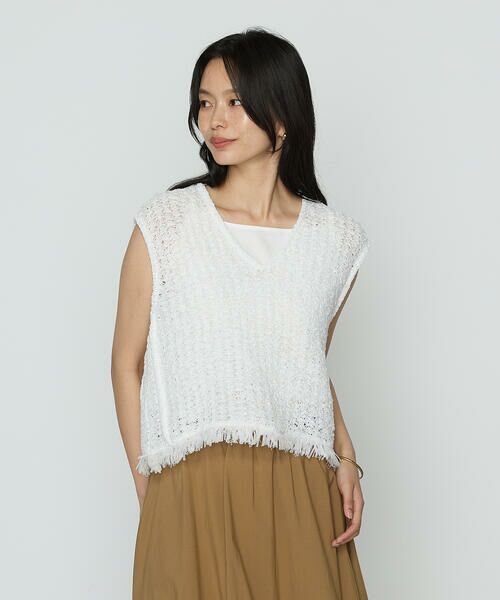 すとんとしたボックスシルエットで夏らしい清涼感あるイメージのサマーツィードニットジレです。