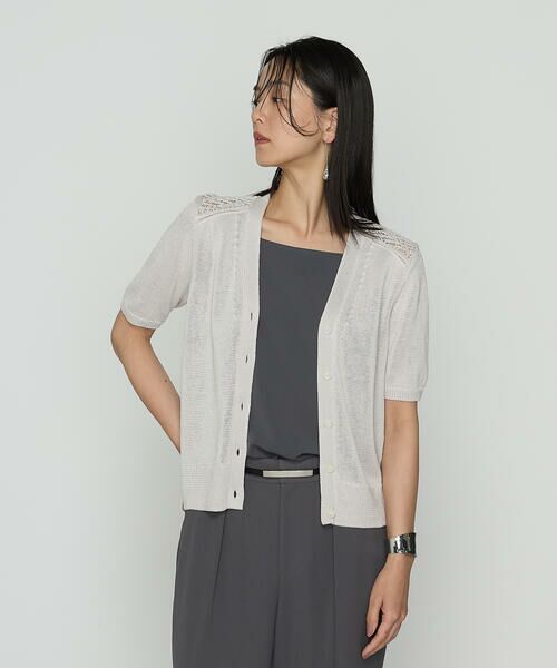 前身頃は天竺でシンプルに、後ろ身頃はミドルゲージの透かし柄に編み立てて、前と後ろの編地のギャップが楽しいニットカーディガンです。