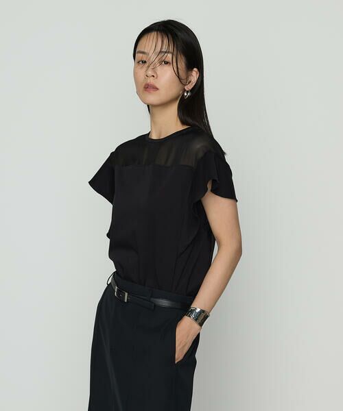 透け感のあるカラミときれいめなジャージーをドッキングしたブラウスのような感覚で着れる、プルオーバーです。