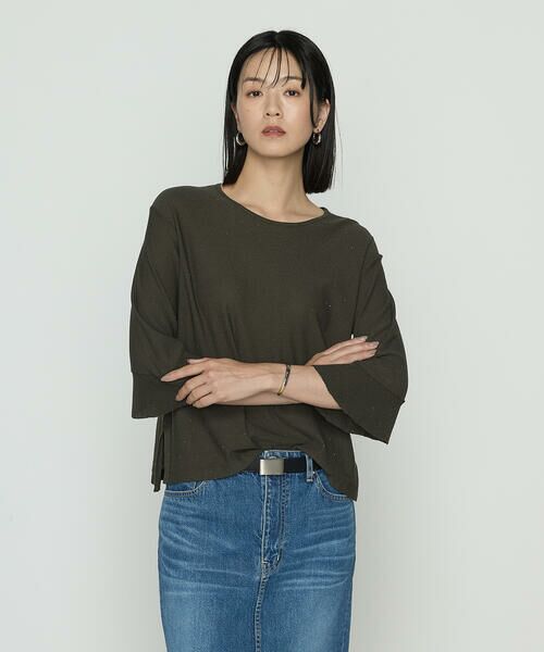 六分袖にガーター編みのフリルが付いたスパンコールニットプルオーバーです。