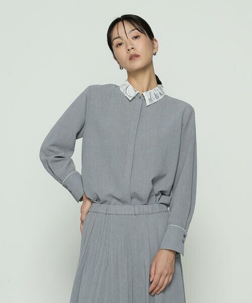 《デザイン》シーンで着替える2WAYレース襟付きシャツです。シャープな素材感でつくったシンプルなシャツに釦で取り外せる立体感のあるケミカルレースの襟が付いているシャツです。トップグレーのシャツには白レース襟、ネイビーのシャツにはクロレース襟の配色にしています。袖口のカフス縫い代をあえて外側に出し、襟と同色のメローロックを施し襟を外したバンドカラーにしてもマニッシュに決まる一着です。《素材》撚糸によるドライタッチで染め分けによるシャンブレー感を出した平織り素材です。天然調の合織オーガンジーです。かりっとした肌当たりが夏から秋の暑い時期に丁度良い素材感です。