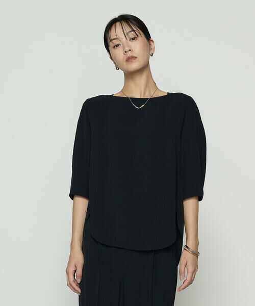 シンプルながらも一枚でサマになるポイントは、シャープなネックラインに対し丸みのある袖とシャツテールによる柔らかさのバランスが凛とした女性像を演出してくれます。