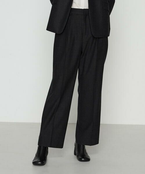 脇高のタックでボリューム感は出しつつ、ウエスト周りは薄く見せると共に、タックから続くセンタープレスで、たてのラインをつくり脚長に見せてくれる効果が期待できます。