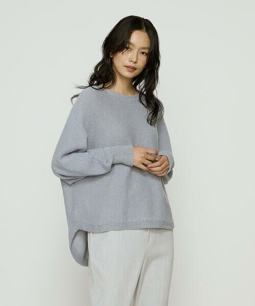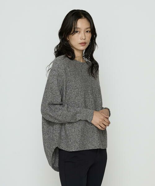 袖口から編むタイプの編み目が横に走るニットで、襟のカーブからヘムラインのカーブまで編み続きで一気に編み上げています。