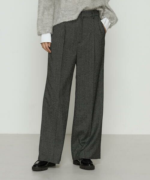 《デザイン》ピンヘッドツイードの奥行きある表情が上品さを引き立てる、脚長効果が期待できるワイドパンツです。マニッシュな美ワイドシルエットでヒップ周りにゆとりを持たせつつ、ストレートワイドから膝上を緩やかに絞っていて縦長ラインを強調するツータックです。ベルトは後ろゴム仕様で快適な着心地で細ベルトを合わせるのがおすすめです。同素材のブラウス(商品番号:96-14BM02-205)とセットアップでクラシカルに、単品でも着まわし力抜群のアイテムです。《素材》針の頭のような細かい柄が特長のウォーム感のあるツイード素材で、点在する多色のネップ(紡績工程でできる不規則な繊維のかたまり)がモードです。ウール混紡の杢糸やシルクネップを組み合わせたピンヘッドツイードで、ブラックのベースにオフホワイトのピンヘッドで無地ライクな見え感でありながら、レッドやパープルのネップがアクセントになりクラシカルフェミニンな表情もあります。良質な原料のウールを使用しながらも、ポリエステルと混紡することで暖かさとすっきりとした風合いを表現しています。