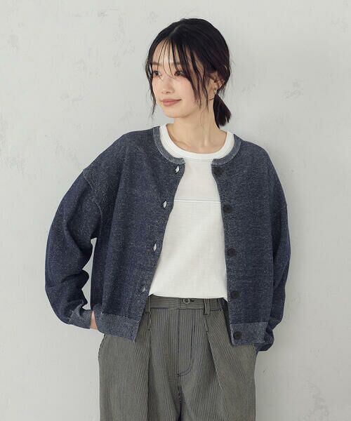 09.ネイビーカラーはデニム調のニット羽織りとして、