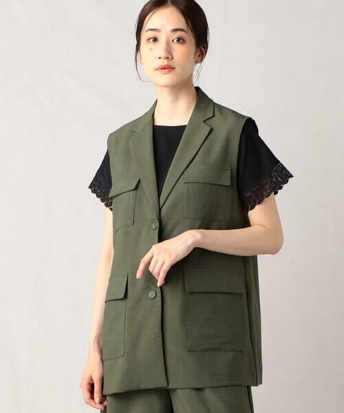 オフィスシーンにも対応できるテーラードカラーのスリーブレスジャケットに、ワークウエアの象徴ともいえる、フラップ付きアウトポケットを4つ付けています。