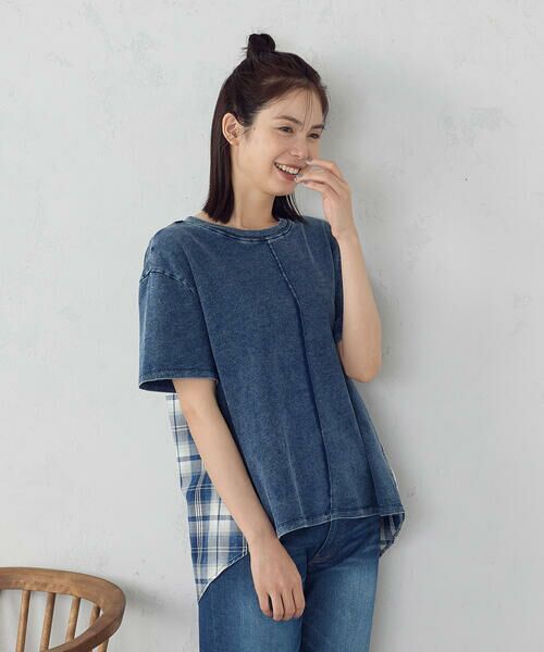 後身頃をインディゴ染めのチェック生地で切り替えた、