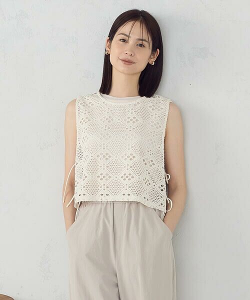 \さっと重ねて、こなれ感をプラス大人涼し気レイヤードスタイル/《デザイン》毎日のコーディネートに変化を加えるレースサマーベスト。トレンドのコンパクトなシルエットです。サイドはリボンで結ぶ仕様で、ボリュームスリーブのトップスとのレイヤードスタイルも楽しめます。サイドのリボンは結んでも垂らしても◎お手持ちのインナーで様々なレイヤードが楽しめます。《素材》クロシェ風の透かし柄が印象的なレースを使いました。立体感があり、どこか懐かしさを感じさせます。……………………透け感:あり厚さ:普通伸縮性:なしポケット:なし裏地:なし洗濯方法:洗濯機(弱)OK、洗濯ネット使用してください。※レース部分のひっかけに注意してください。……………………