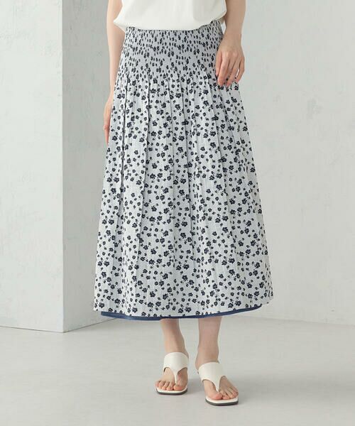 《デザイン》山形県米沢市で織り上げられ、米沢市内で縫製された、Made in Japanの商品です。ウエストからミドルヒップにかけて、生地を織る段階で、ヨコ糸にゴム糸を織り込んでいるので、切り替えなく、膨らむことなく、スムーズに体になじんでくれます。このスカートは、サイズの許容も広く、7号くらいから15号くらいの方まで、体型を問わず、美しくはくことが出来ます。表側の小花柄は、無地物のトップスと合わせても、個性のある上品なコーディネートが作り出せます。裏側は、トップ調のカラーで、汎用背の高いスカートとなっています。《素材》日本有数のジャガード産地、山形県米沢市で、熟練された職人さんによって、丁寧に織り上げられた素材です。表は、二枚の薄い生地が、柄の部分で入れ替わる、風通ジャガードという手法で、ドット風な小花柄を作り出しています。裏側は、トップ染め調の糸を使い、汎用性を高めたスカートにしています。……………………透け感:なし厚さ:普通伸縮性:なし光沢感:なし裏地:なし洗濯方法:ドライクリーニング……………………