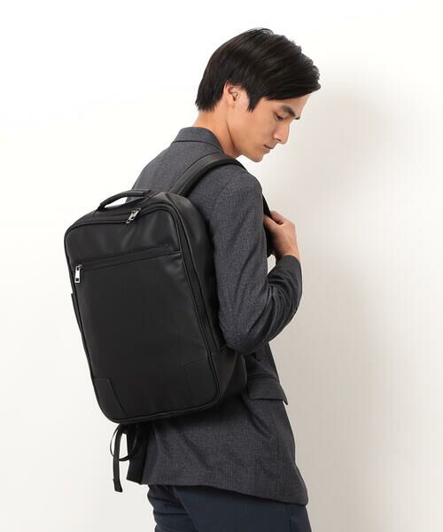 シボ感のあるシュリンクレザータイプの合成皮革を使用した、スタイリッシュで洗練された印象を持ったビジネスバックパックです。