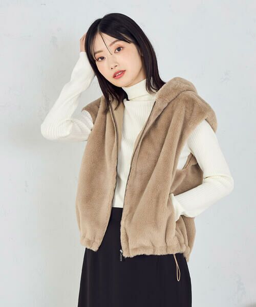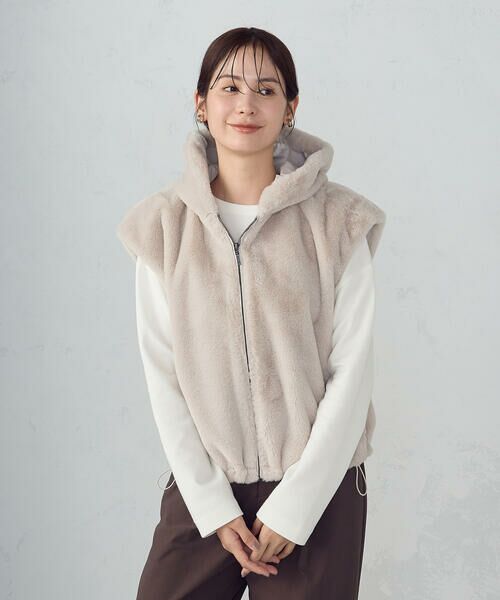 《デザイン》フードデザインで襟元にボリュームを持たせたフーデッドファージレです。ラビットのような短めの優しい毛足が、かわいらしい印象です。続きの短い袖が、シルエットにニュアンスをつくります。目立たず、スッキリと仕上げるために脇にスラッシュポケットを付け機能的に仕上げました。ファスナー開きデザインが、スポーティーでアクティブな印象。裾はドローストリングスで絞って、ニュアンスを作ることが出来ます。羽織るだけで秋感をいち早く取り入れられる、便利アイテムです。《素材》ラビットような柔らかい短めファー素材です。基布がジャージー素材なので、ストレッチ性がありストレスフリーな着心地です。……………………透け感:なし厚さ:厚地伸縮性:あり光沢感:ややあり裏地:あり洗濯方法:ドライのみ……………………