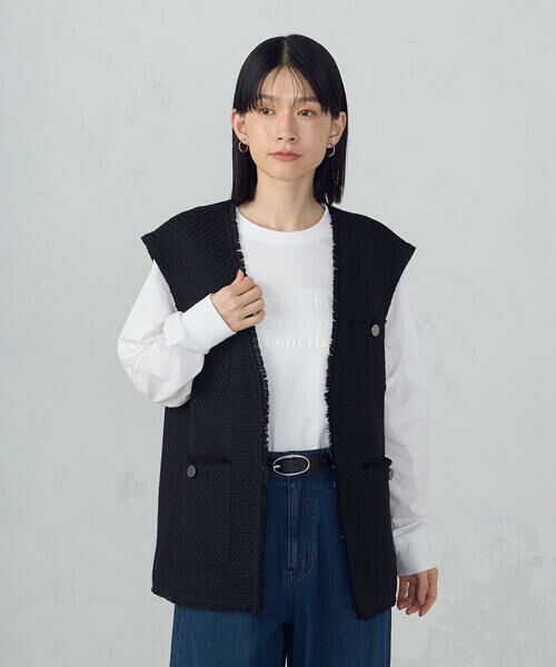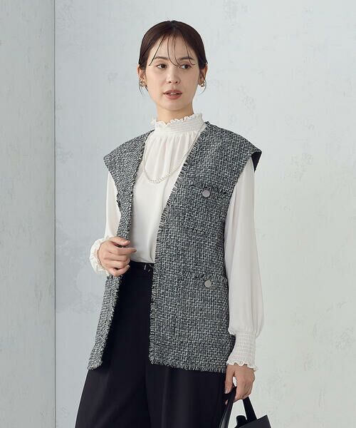 《デザイン》クラシックなツイードを、現代的なモード感で昇華したロングジレ。表情豊かなファンシーツイード素材にフリンジディテールを施し、立体的でリズム感のある仕上がりに。シンプルなスタイリングにプラスするだけで、奥行きのある着こなしが完成します。フロントにはさりげない存在感を放つメタル調のボタンをあしらい、辛口なアクセントに。長めの着丈は気になるヒップラインを自然にカバーしつつ、縦のラインを強調してすっきりと見せてくれます。インナー次第で季節の端境期からロングシーズン活躍し、タートルニットやシャツとのレイヤードが楽しめます。《素材》存在感のある表情を持つ、表情豊かなファンシーツイードです。さまざまな意匠糸を織り交ぜたリッチな素材感は、光の加減や動きに合わせてさりげなく表情を変えシンプルなシルエットに奥行きをもたらします。……………………透け感:なし厚さ:厚手伸縮性:なし光沢感:なし裏地:あり洗濯方法:ドライクリーニング……………………