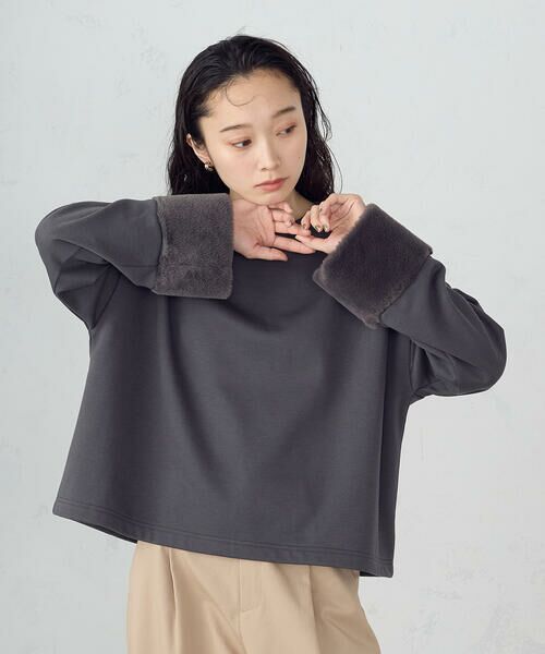 《デザイン》袖口のファー使いが印象的な異素材ドッキングプルオーバー。体を包み込むようなゆったりとしたオーバーサイズで、そのまま着ただけでスタイル良く着こなせるコンパクトな丈感です。ネックラインは詰まり過ぎないクルーネックです。裾はラウンドさせてヒップ周りも気になりません。品よく着こなせる大人の1着です。《素材》裏毛の内側をふんわりと起毛させた裏起毛裏毛を使いました。内側を起毛をさせることで生地の中に空気が多く含まれ保温性が高まります。肉厚で柔らかく、優しい着心地です。袖口にはふわふわとした柔らかなファーを使いました。……………………透け感:なし厚さ:中肉伸縮性:あり光沢感:なし裏地:なし洗濯方法:洗濯機(弱)……………………
