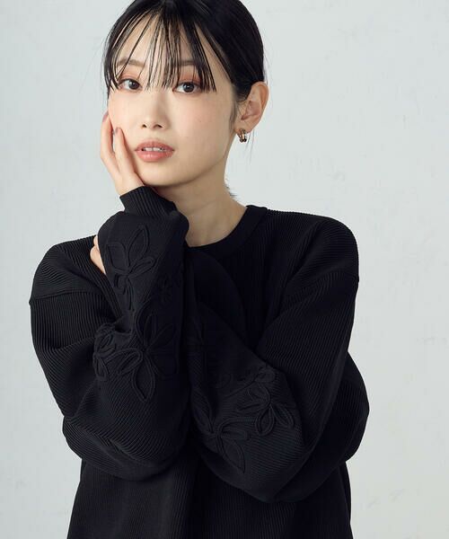 シンプルなクルーネックのニットの袖口に刺繍が入っています。