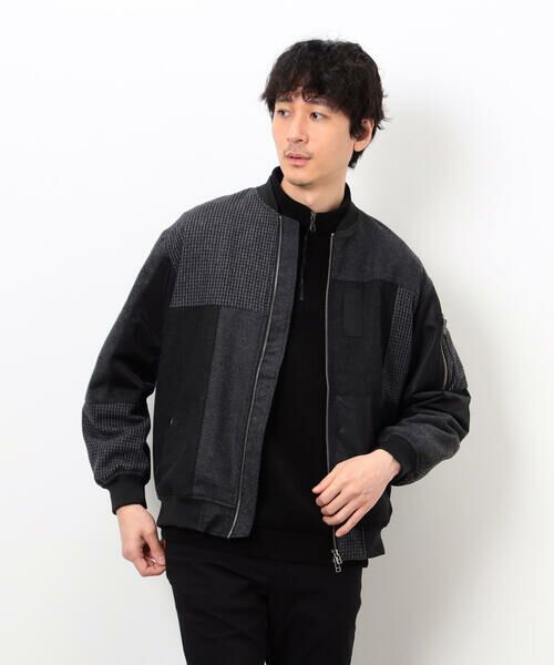 ヘリンボーン柄、ホームスパン(ざっくりとした表情のツイード)、千鳥柄のツイードに加えMA-1ならではのナイロンツイルをパッチワークしています。