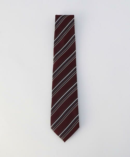 《デザイン》ベーシックなレジメンタルストライプ柄のレギュラータイです。ベースのカラーに対して、控えめなストライプのカラーにすることにより、合わせやすく、上品な雰囲気に仕上げています。糸量が多く、張り感のある風合いなので、立体的に巻くことができ高級感のある仕上がりになっています。《素材》上品な光沢感の絹素材を使用して織り上げた素材です。京都の老舗の機屋で織り上げています。