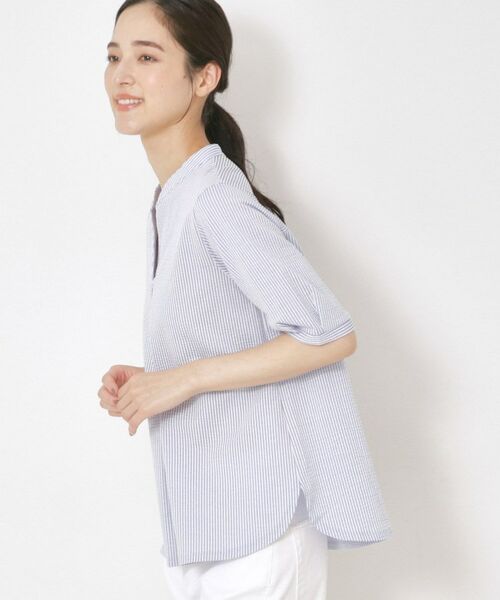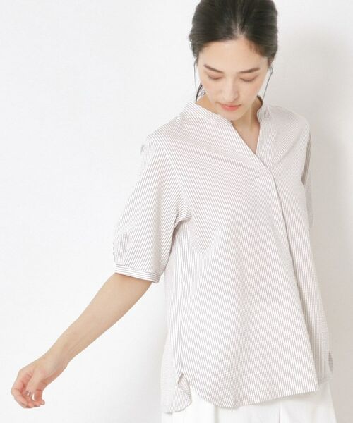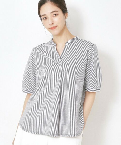 お顔まわりをすっきり見せつつ女性らしい印象のキーネックデザイン。