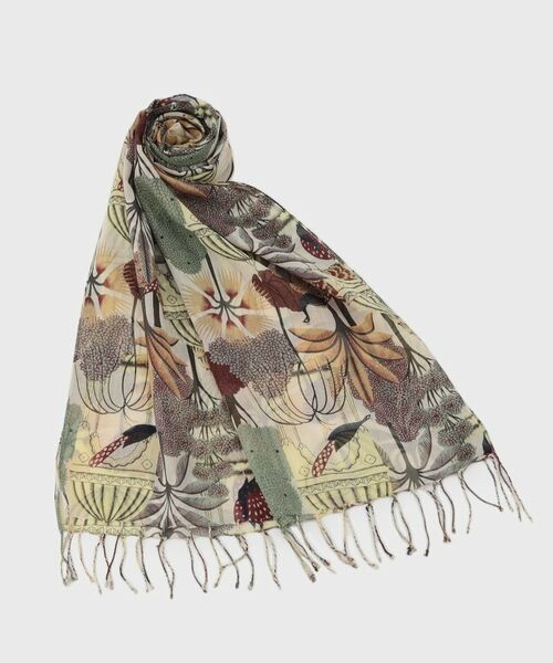 エキゾチックな雰囲気を醸し出し、色とりどりの植物や鳥が描かれたグリーン系のストール。