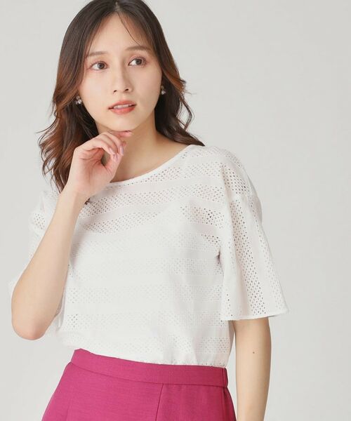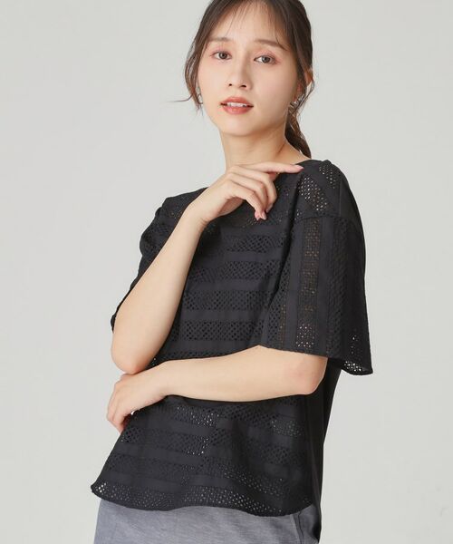 ジオメトリックなボーダーレースとジャージ素材を合わせた映える1枚着カットソー。