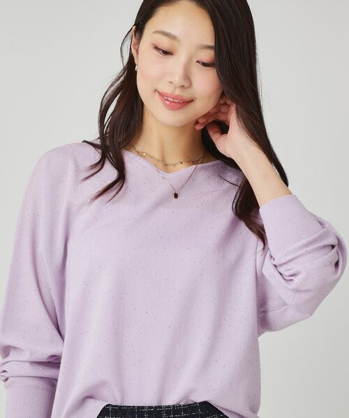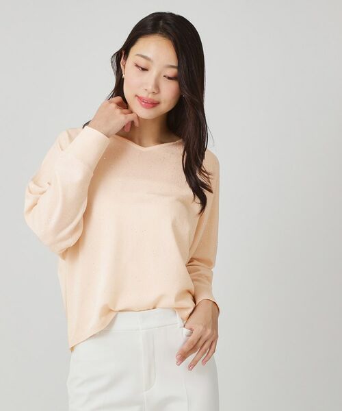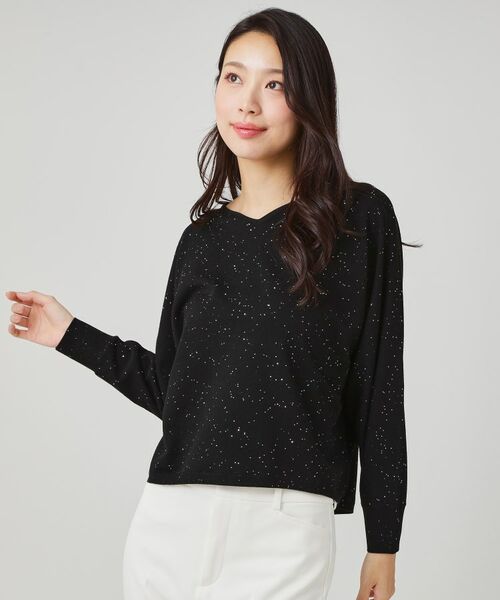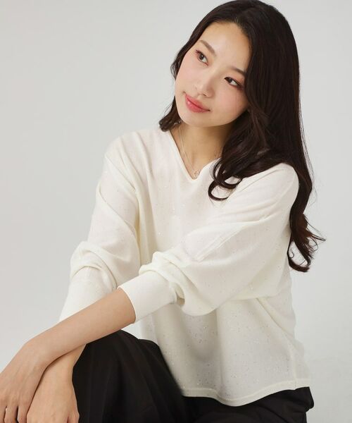今シーズン注目の「1ミリスパンコール」を贅沢にあしらった、上品で華やかな印象のVネックトップス。