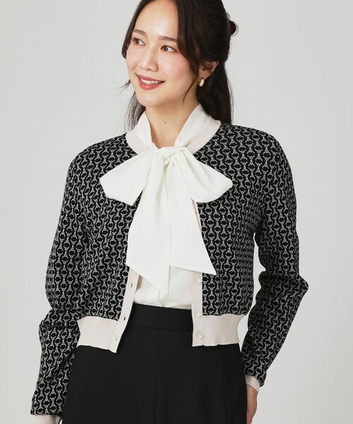チェーン風の柄が印象的な幾何柄風のジャカードカーディガン。