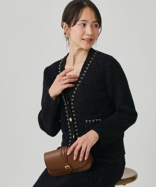 ラメフェザーモールの華やかなきらめきと、メタルチェーンブレードのゴージャスなアクセントが眼を惹く主役級ニットカーディガン。