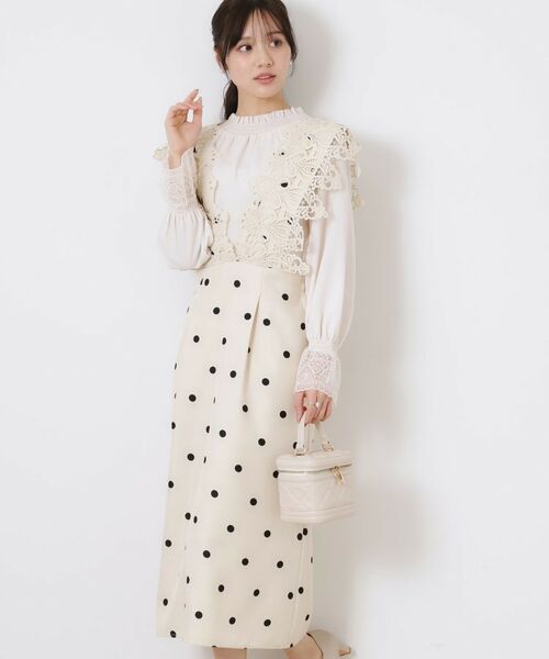 【デザイン】Vネックのすっきりとしたシルエットのドットジャンスカに、華やかなレースをたたいたデザインジャンスカ。二次会やセレモニーなどきれいめなシーンにも活躍してくれる一着。ブラウスやすっきりしたニットやカットソーとのレイヤードがおすすめです◎【仕様】・ポケットなし・ウエスト後ろゴム・裏地あり※オフホワイト(103)はやや透け感があります。■サイズ表示について※バイイング商品のため下げ札サイズ表記とワールドサイズ表記が異なります。製品寸法をご確認くださいませ。ワールドサイズコード38=製品サイズ表記Mワールドサイズコード40=製品サイズ表記L※照明の関係により、実際よりも色味が違って見える場合があります。また、パソコン・スマートフォンなどの環境により、若干製品と画像のカラーが異なる場合もございます。本商品は、ご注文確定後に取り寄せにてお客様への出荷手配をさせていただきますので、お届けまでに7~10日前後かかる場合がございます。また、商品は他社サイトと在庫を共有しているため、ご注文いただいた商品が欠品となり、キャンセルとなる場合がございます。