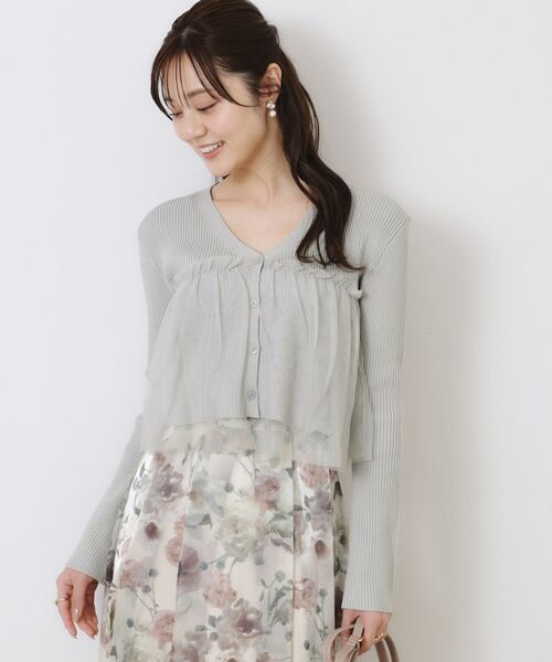 チュールを重ねたデザインがかわいい、Vネックカーディガン。