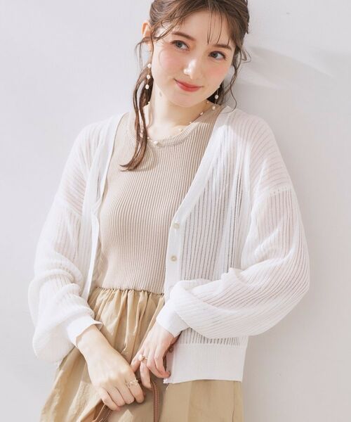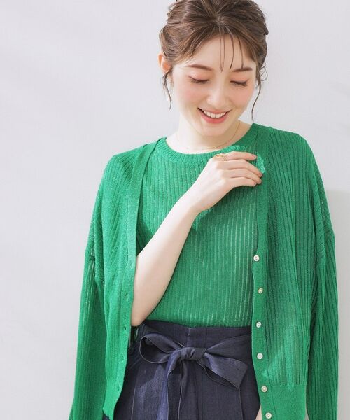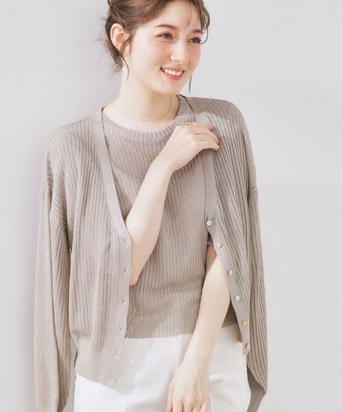 上品なラメが入った糸を透かしリブ編みした、サマーニットカーディガン。