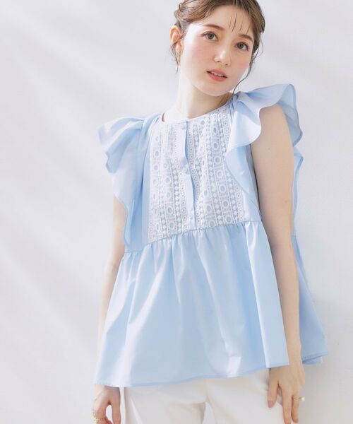フロント部分にレースをたたいた、ふんわりとしたチュニックブラウス。