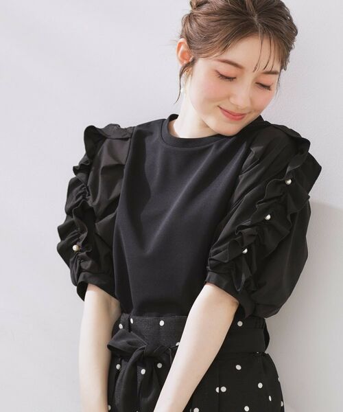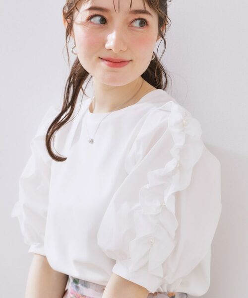 袖にフリルとパール調パーツをあしらった、布帛素材をドッキングしたデザインプルオーバー。
