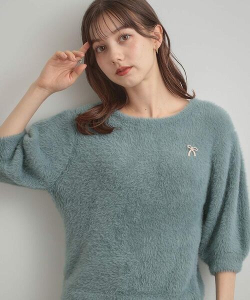 パール調リボンモチーフを付けた5分袖ラメフェザーニットトップス