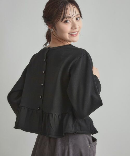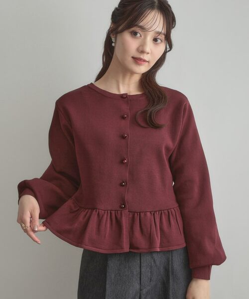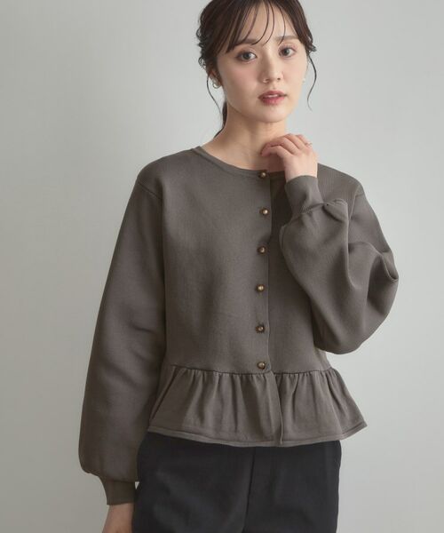 ポリエステル100の軽やかな糸を使用したペプラムデザインカーディガン。