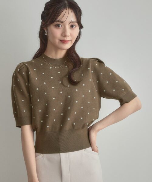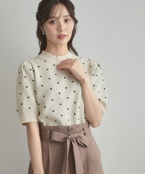 レーヨン混の程よい肉感のドットジャカード編みがポイントの半袖デザインニット。