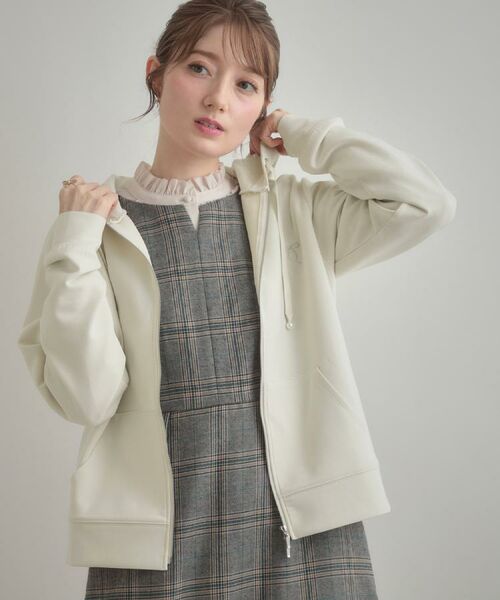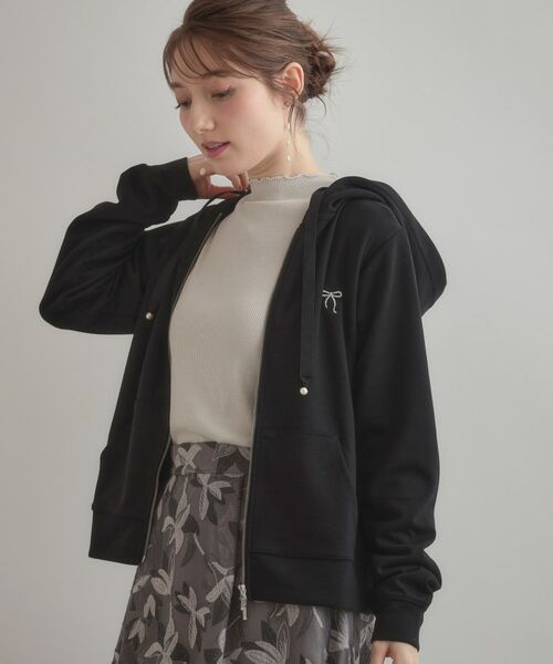 左胸にリボンのさりげない刺繍と、紐先にパール調パーツのついたクチュールらしいデザインパーカー