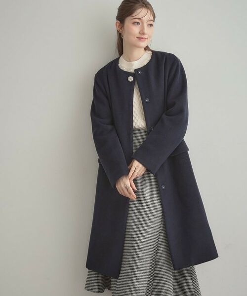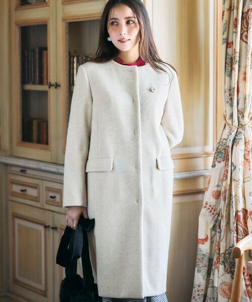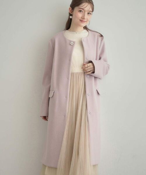【通勤/ビジューブローチ付き】ノーカラー ロングコート