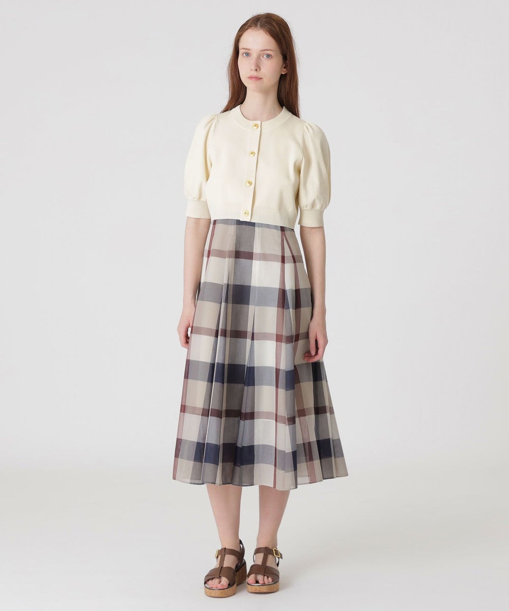 ◆冷房対策にも活躍するミニ丈カーディガン【Design】パフスリーブがキュートなミニ丈カーディガンです。ブランドアイコンの大きなボタンがデザインポイントです。素材特性上シワになりにくく、バッグの中に忍ばせておくにも便利な一枚。フロントボタンを留めたプルオーバー風の着用も今年らしく、おすすめです。【Styling】ニットドッキングドレス(55J34564)とのコーディネートがおすすめです。