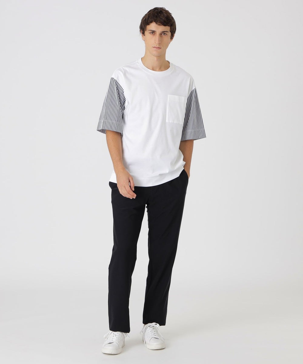 袖にロンドンストライプ柄をあしらった、ややオーバーサイズフィットのTシャツ。ジャージー素材のボディに袖のストライプはシャツ地を使用したドッキングデザインが特徴です。一枚でもスタイリング映えするTシャツです。