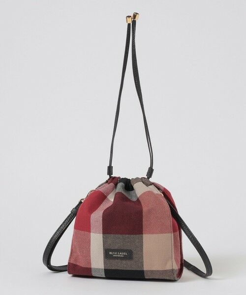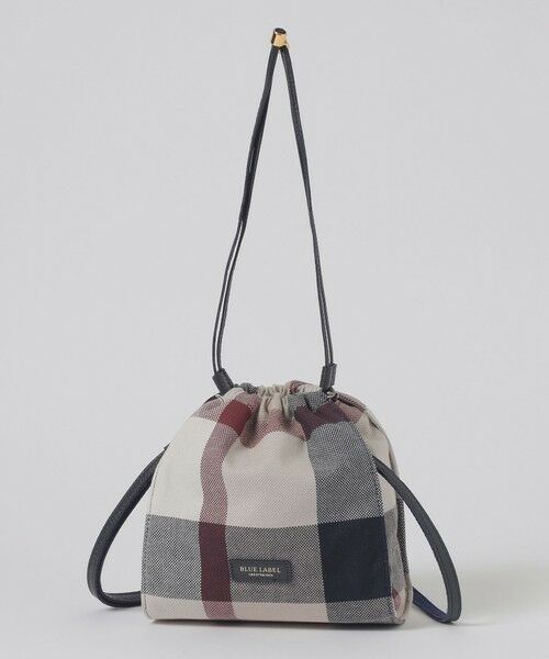 ◆コーディネートのアクセントになるクレストブリッジチェック柄ショルダーバッグクレストブリッジチェックキャンバス素材を使用したショルダーバッグです。ベースがスクエア型の巾着バッグは、カジュアルにもオフィシャルな装いにも、様々なシーンで活躍します。見た目はコンパクトですが、長財布も収納可能です。