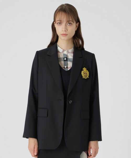 ◆胸元のエンブレムがポイントのテーラードジャケット【Design】胸元のエンブレムがポイントのシングルブレストジャケットです。軽さと羽織りやすさがあり、多用途でタイムレスなウェアです。プレッピーな金モールのエンブレムは、その日の気分で取り外し可能です。【Styling】ニットベスト付きブラウス(55M06625)とサイドチェックミニスカート(55S04622)をコーディネートすれば、今年らしいプレッピースタイルをお楽しみいただけます。パンツスタイルとも相性抜群です。