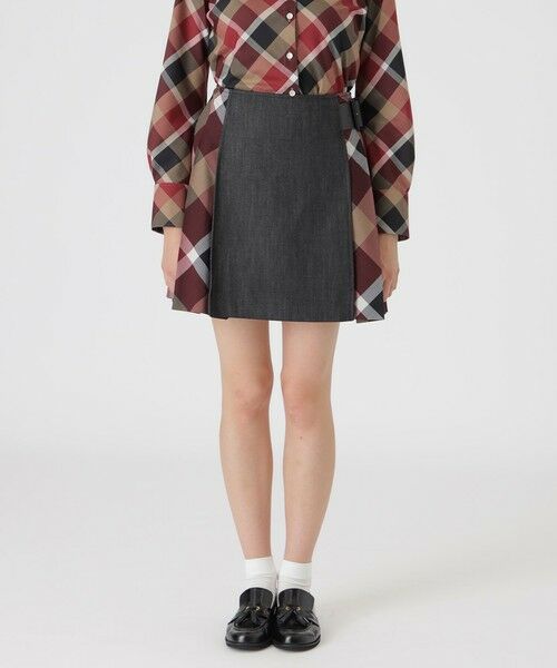◆サイドチェックがポイントのミニスカート【Design】トラディショナルな巻きスカートをイメージしたミニ丈スカートです。サイドのプリーツ部分のチェックがポイントです。ウエスト後ろはファスナー仕様になっているので、着脱も快適です。