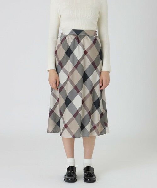 ◆軽やかなサテン素材のクレストブリッジチェック柄スカート【Design】クレストブリッジチェック柄のサテン素材を使用したスカートです。後ろウエストはゴム仕様になっているので着脱も着心地も快適です。ベーシックなデザインでトップスを選ばす、タイムレスに活躍するブルーレーベルらしい一着です。※展開店舗については、店舗在庫確認ボタンよりご確認ください。