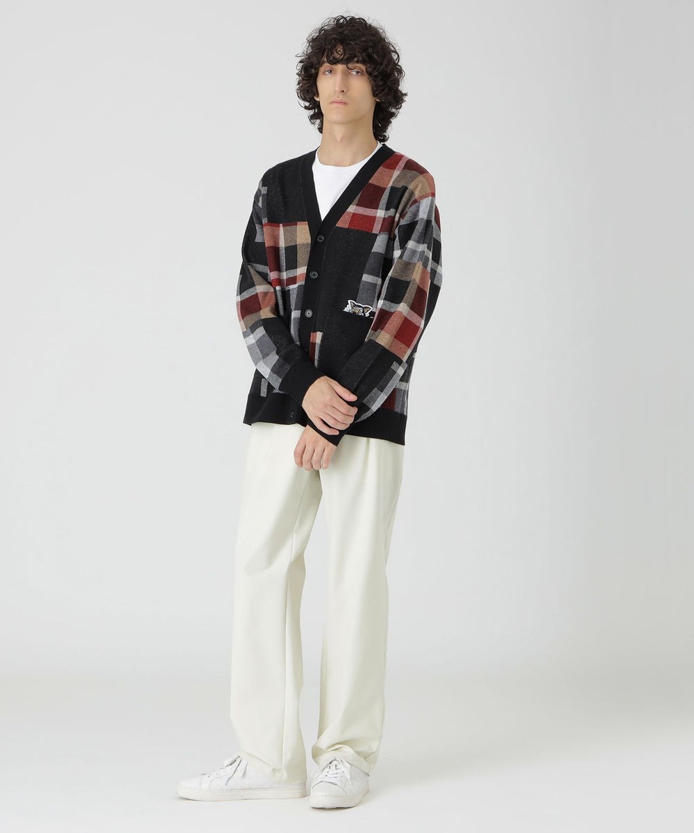 【全面をパッチワーク調に切り替えた遊び心あるニットカーディガン】全面をチェック柄で切り替えた存在感抜群のニットカーディガン。チェック柄とカラーブロックをパッチワーク状にあしらう事で他には無いデザインに仕上がっています。ポケットから猫モチーフ(ブラックレーベル・クレストブリッジ渋谷店の立地するキャットストリートをインスピレーションとしたキャラクター「SWINGING CAT」)のワッペンが覗く遊び心あるデザインがポイントです。素材には繊維の毛羽を抑えたクリアな毛混の糸を使用。編み目がきれいに引き立ち、上品でソフトな風合いに仕上がっています。※展開店舗については、予告なく変更になる場合がございます。