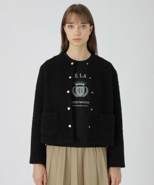 ◆コンパクトで羽織りやすいブークレージャケットふんわりとしたブークレー素材を使ったジャケットです。コンパクトなサイズ感で、ドレスはもちろん、合わせるボトムを選ばずスタイリングがきまります。フロントのゴールドボタンがアクセントになっています。