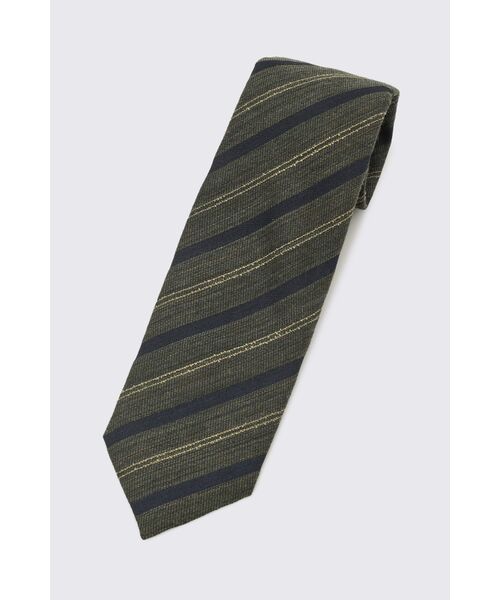 秋冬のVゾーンに季節感を添える、絹50%・毛50%混紡のネクタイです。ウール混ならではのざっくりとした温かみのある風合いが特徴。ベースのオリーブグリーンに、ネイビーとイエローのストライプを配し、独特の重厚感と表情豊かな奥行きを生み出しています。シルクの光沢を抑え、ざらつきのあるラフな織りを採用することで、フランネルやツイードなど、季節のジャケットスタイルと抜群の相性を発揮。DAKSらしい英国トラッドなスタイルを、モダンで洗練された印象に格上げします。