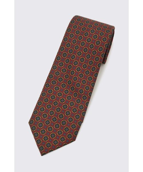 ベースカラーのボルドー(赤茶)に、オレンジ、ブルー、オリーブなどの複数の色を用いた伝統的な小紋柄(マイクロパターン)が織り込まれています。遠目にはシックなトーンでありながら、近くで見ると豊かな色彩と立体感が楽しめ、 Vゾーンに深みと華やかさを与えます。素材は光沢とドレープ性に優れたシルク100%。上質なシルクが、ノット(結び目)を美しく引き立たせ、締め心地の良さと型崩れのしにくさを両立しています。クラシックなスーツスタイルはもちろん、無地のジャケットやシャツに合わせるだけで、格調高いブリティッシュトラッドなスタイルを完成させる一本です。